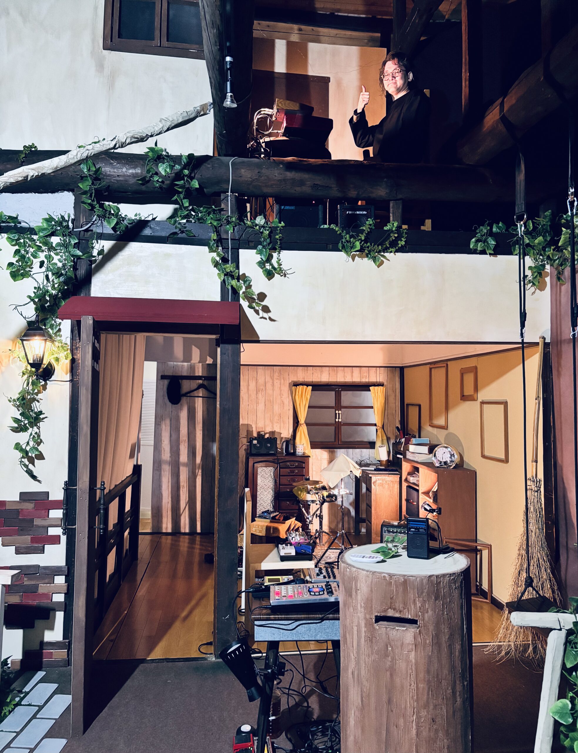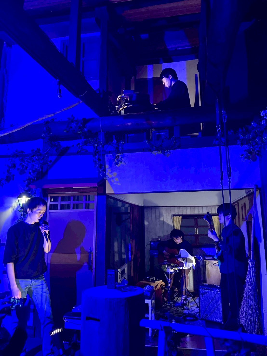 舞台美術は2階建てのアトリエ兼住居といった風合いの家屋で、1階部分で演奏するメンバーと2階部分で演奏するメンバーがいるので演奏中にお互いの姿が全く見えず、演奏の環境でいえば普段の環境とは全く違う。