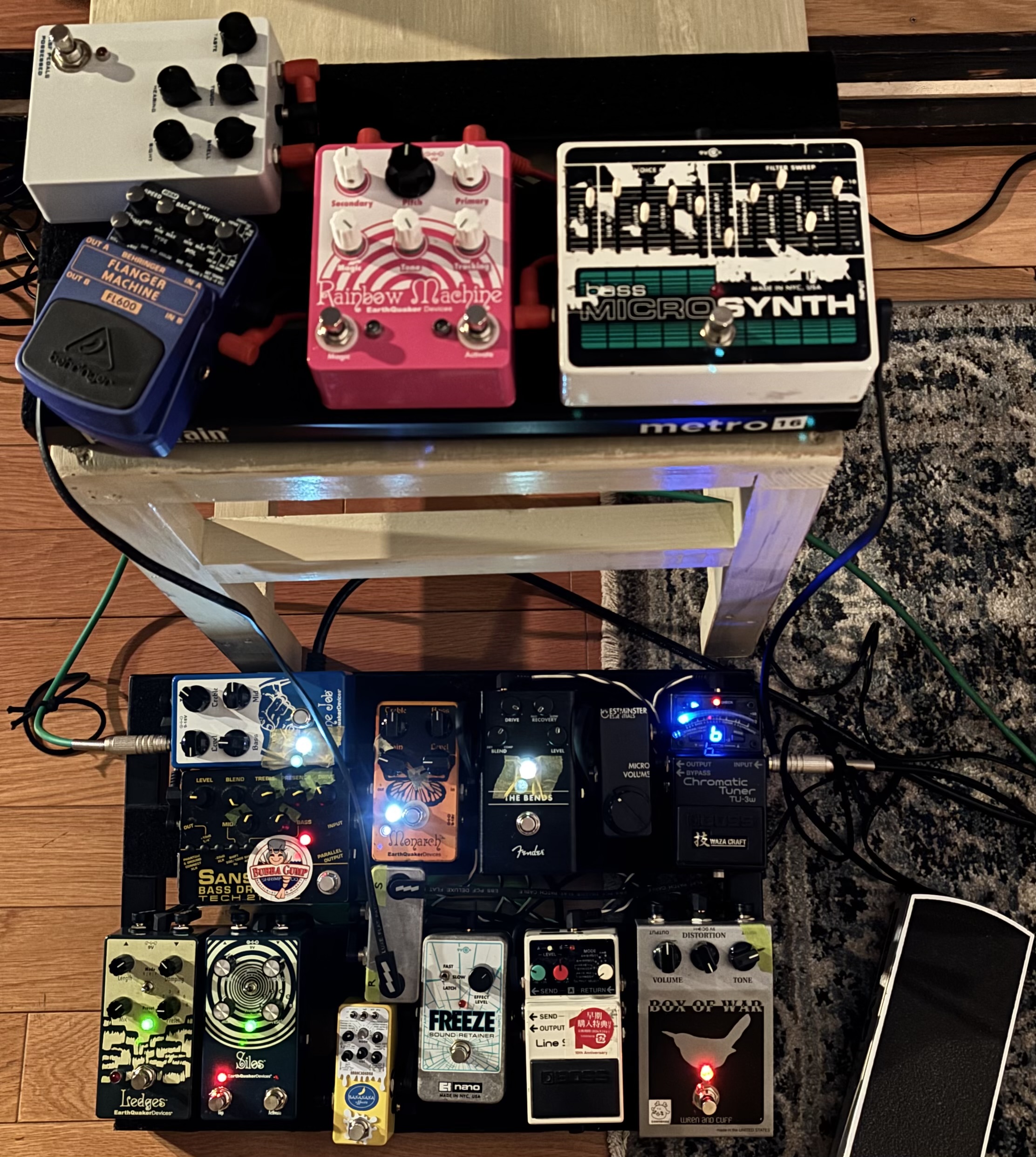 信号経路としては足元のペダルボード内、バッファとか歪みとかプリアンプとか通った後にFREEZE→ボリュームペダル→手元用ボード→空間系→EQ→ベースアンプという超・直列仕様。