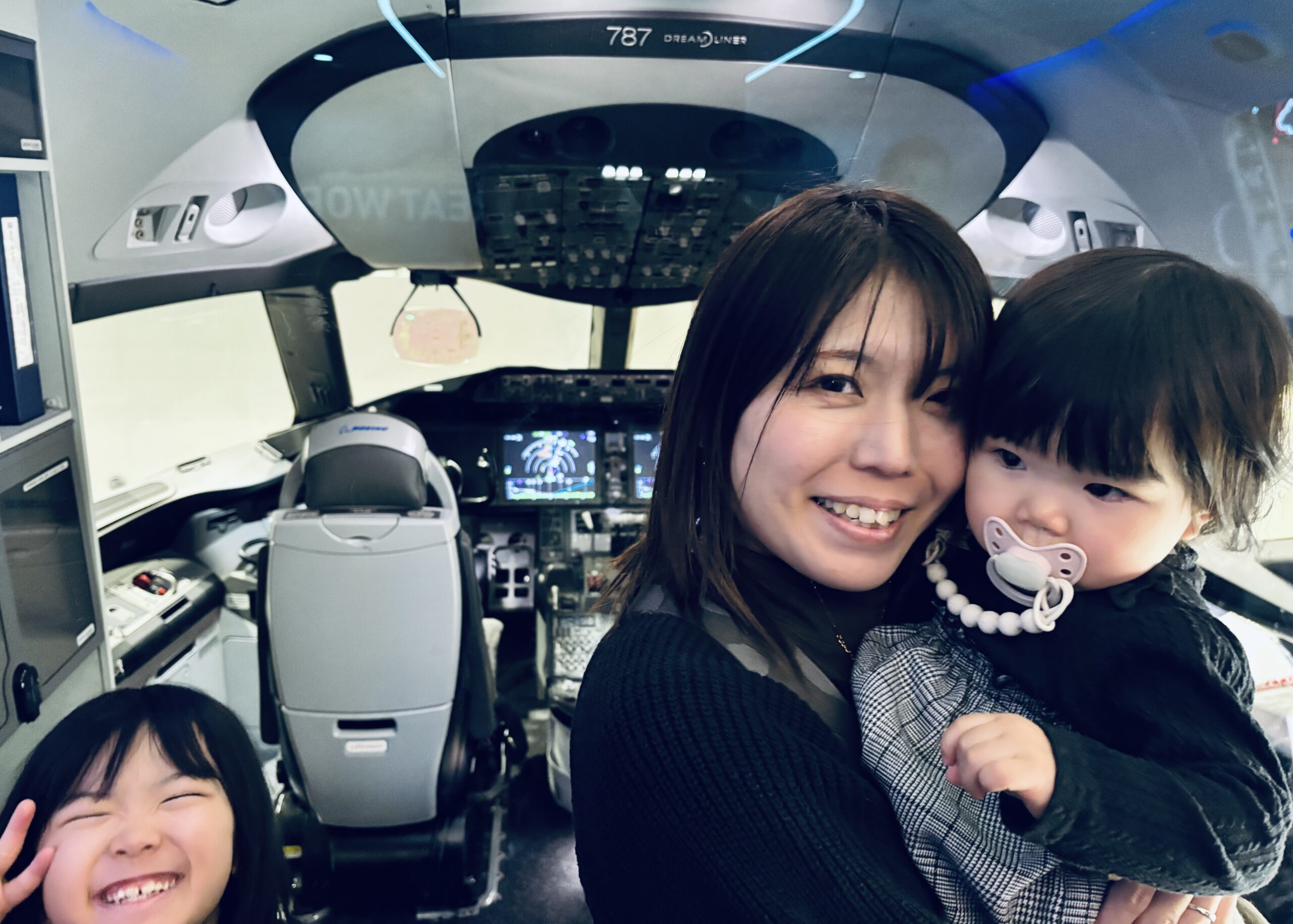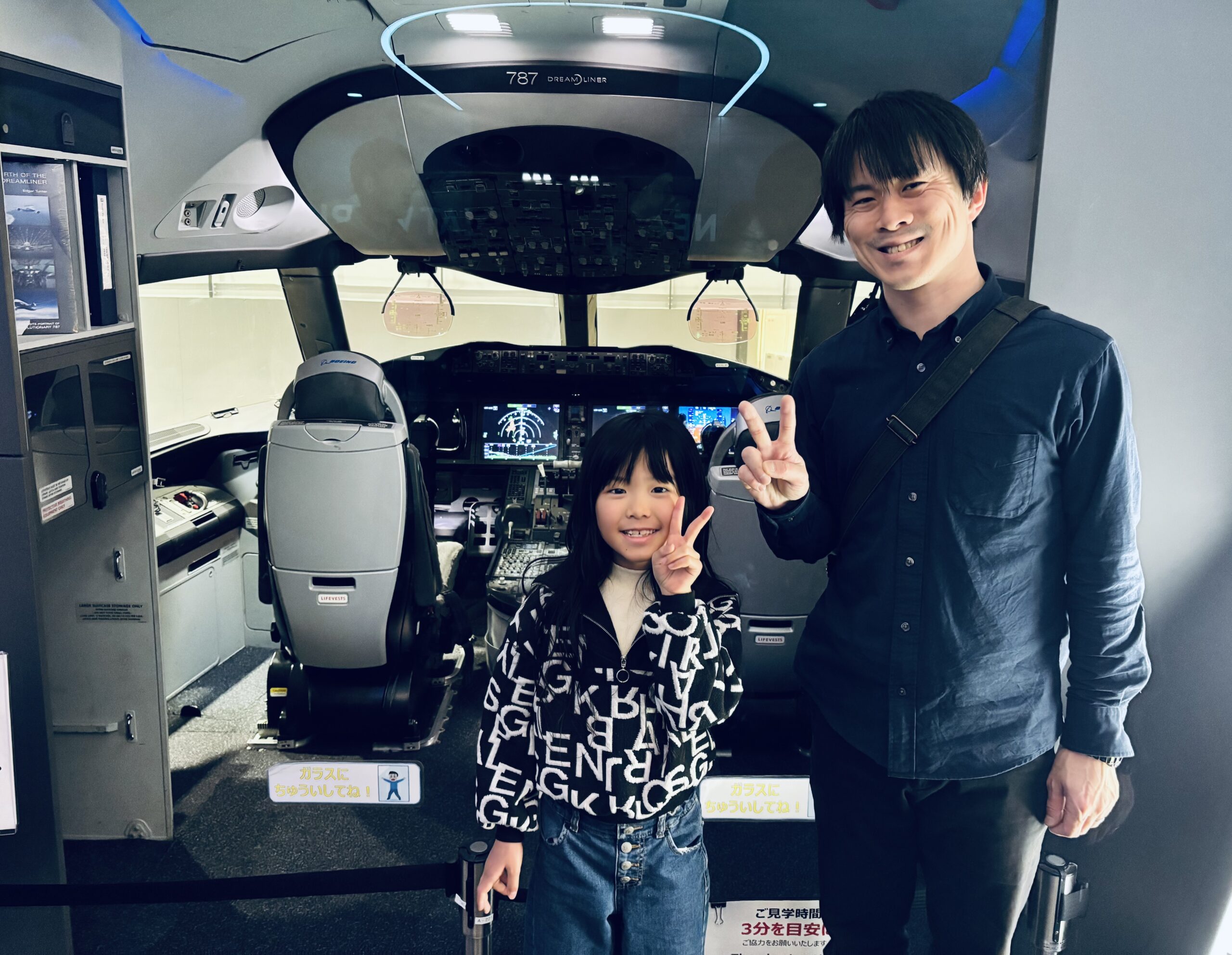 妻と娘(次女)が先にコクピットから出、娘(長女)が見学を終えるのを待っていると僕達の次に並んでいた外国人のカップルがお互いに写真を撮り合っていた。折角なら、と写真を撮ってあげたら「貴方達も撮ってあげるわよ!」と英語で声掛けして貰い、僕と娘(長女)で記念撮影。