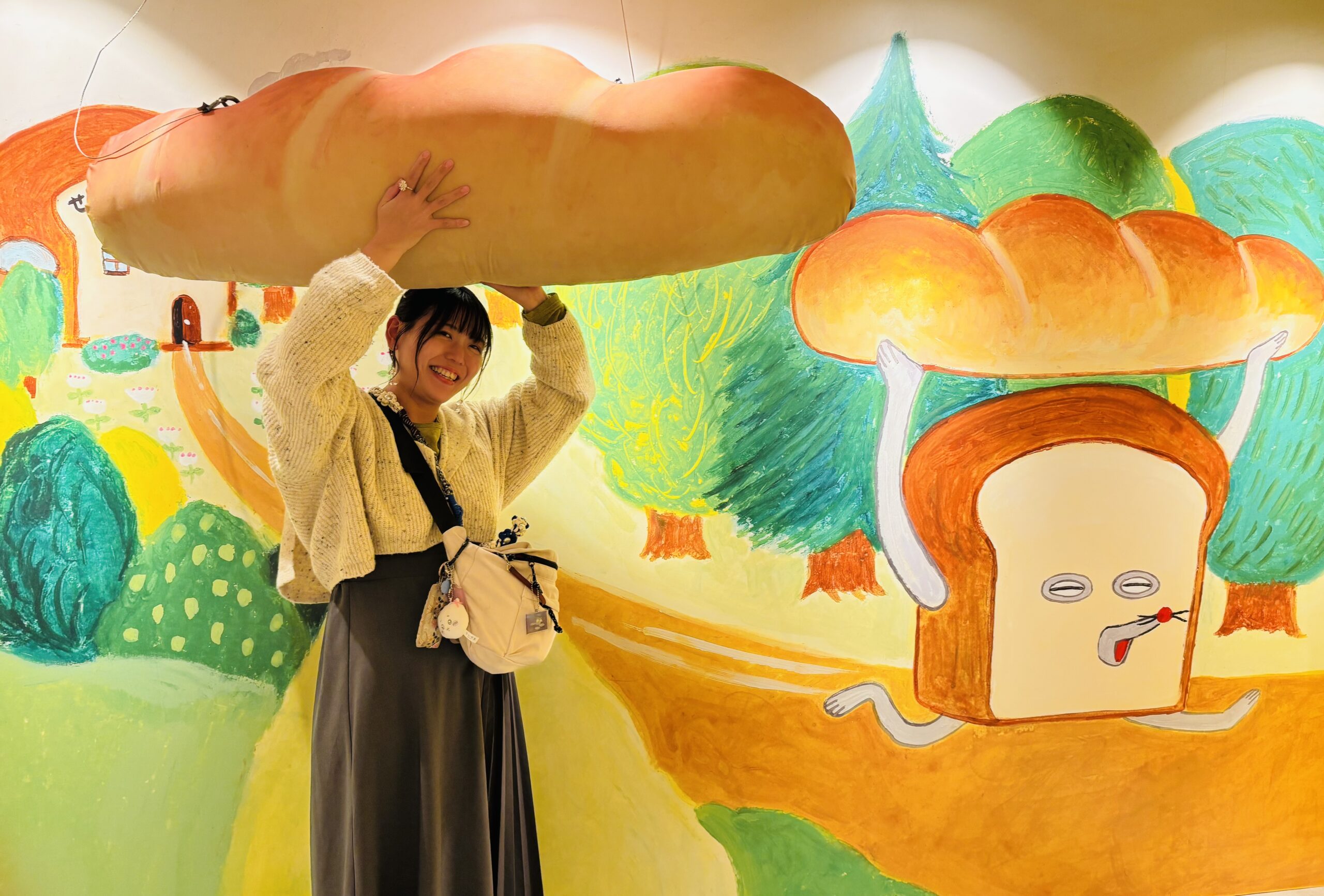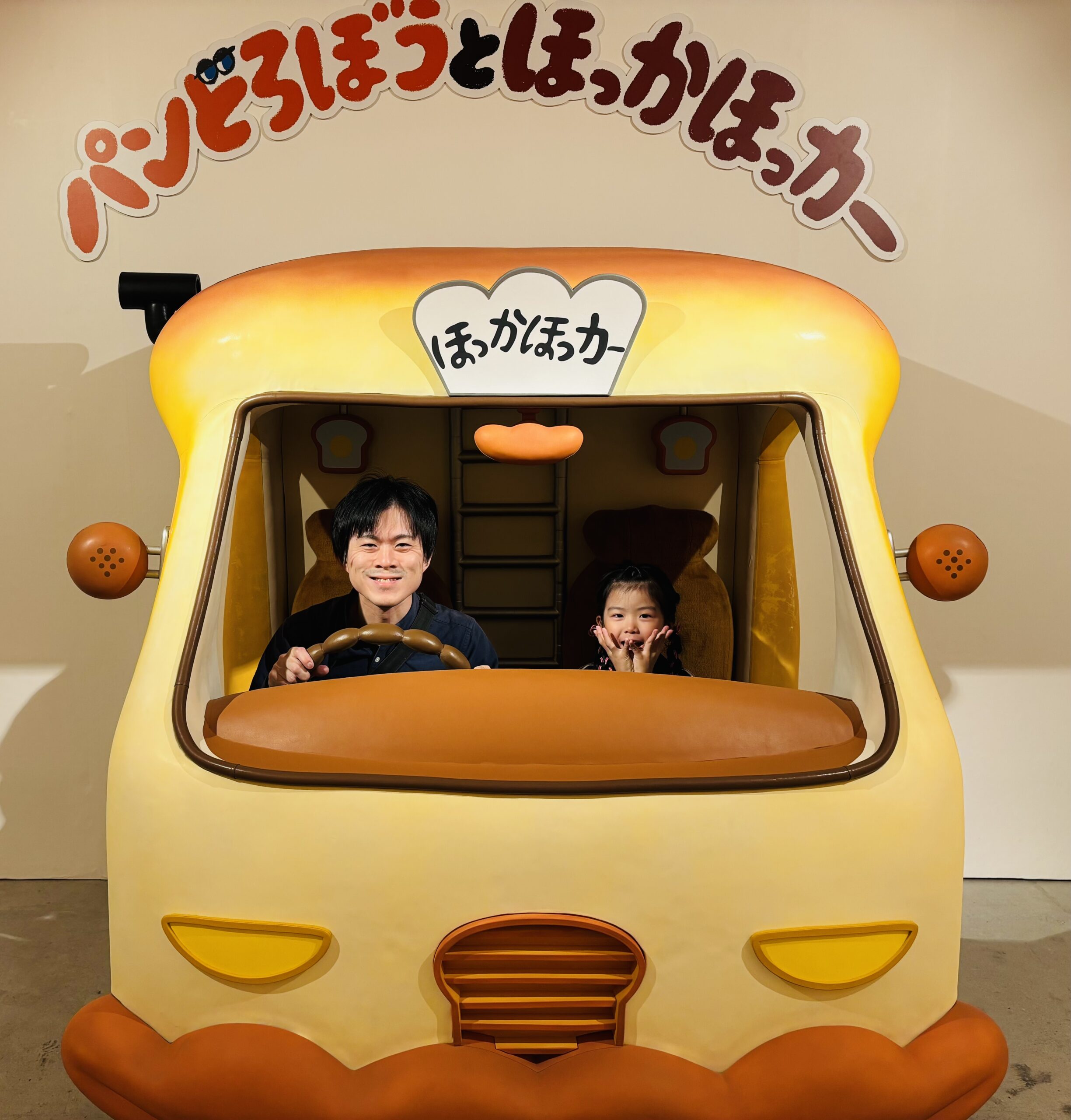 作中のパンどろぼうと同じポーズで写真が撮れてホクホクの妻。