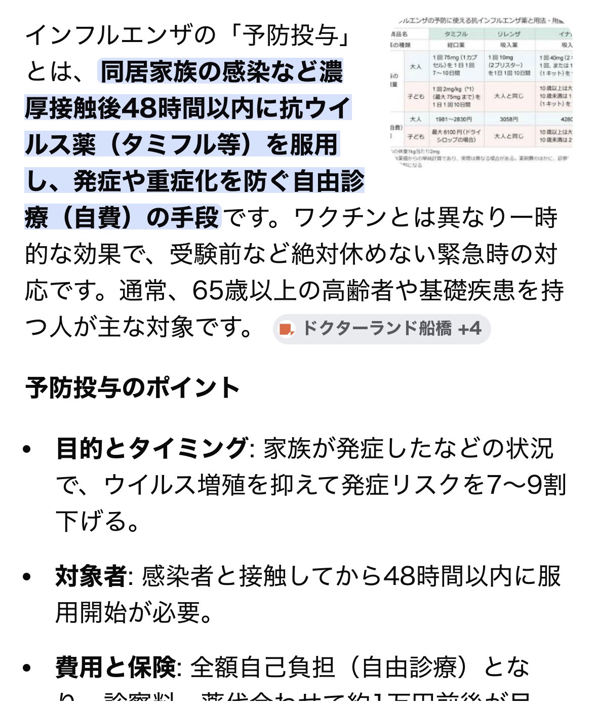 インフルエンザの濃厚接触になった場合、インフルエンザ治療薬を発症前に飲む事で発症や重症化を防ぐ事が出来る、という事。
