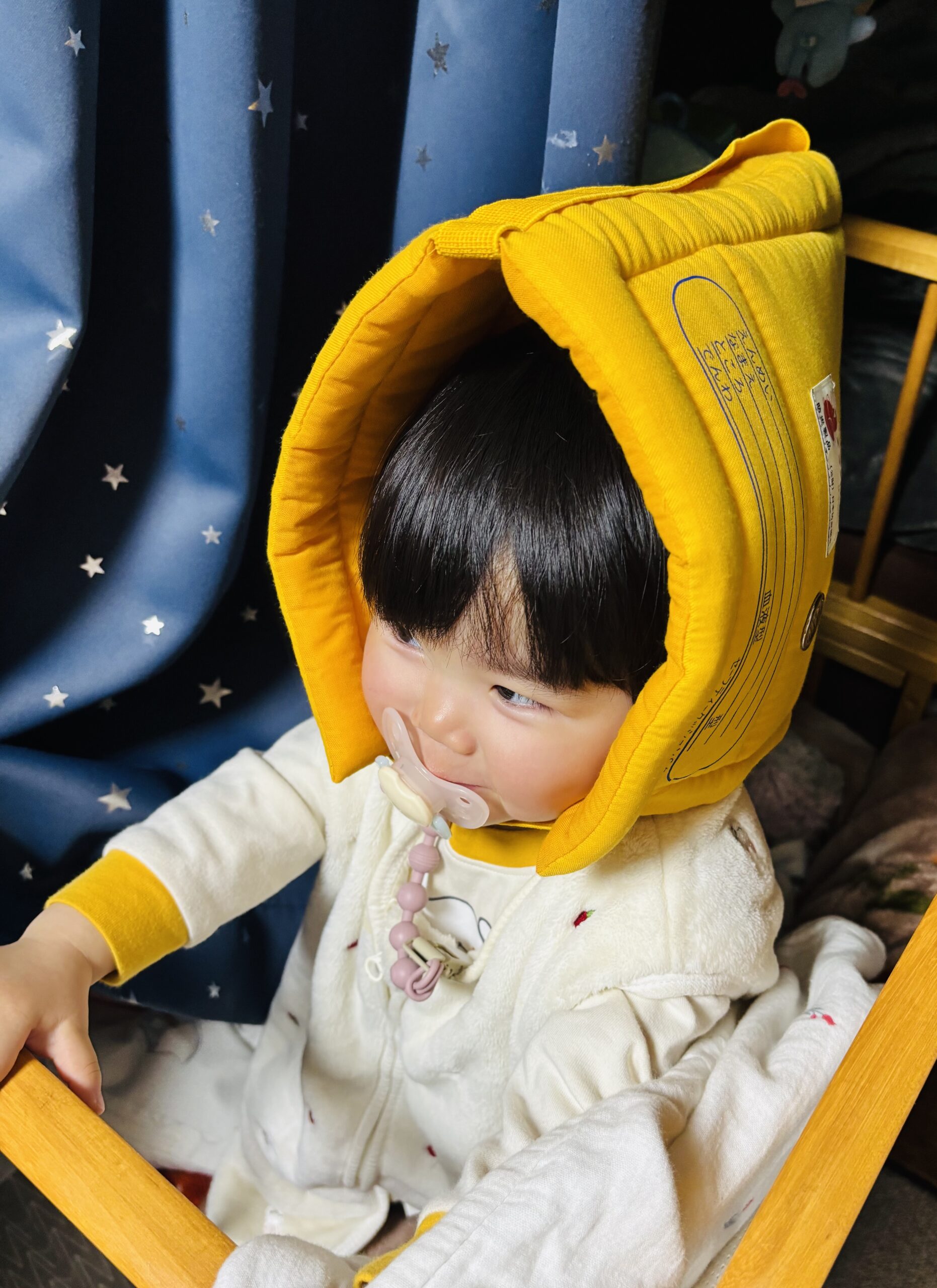 ちなみに写真(↑)は娘(次女)の防災頭巾を被った1枚。