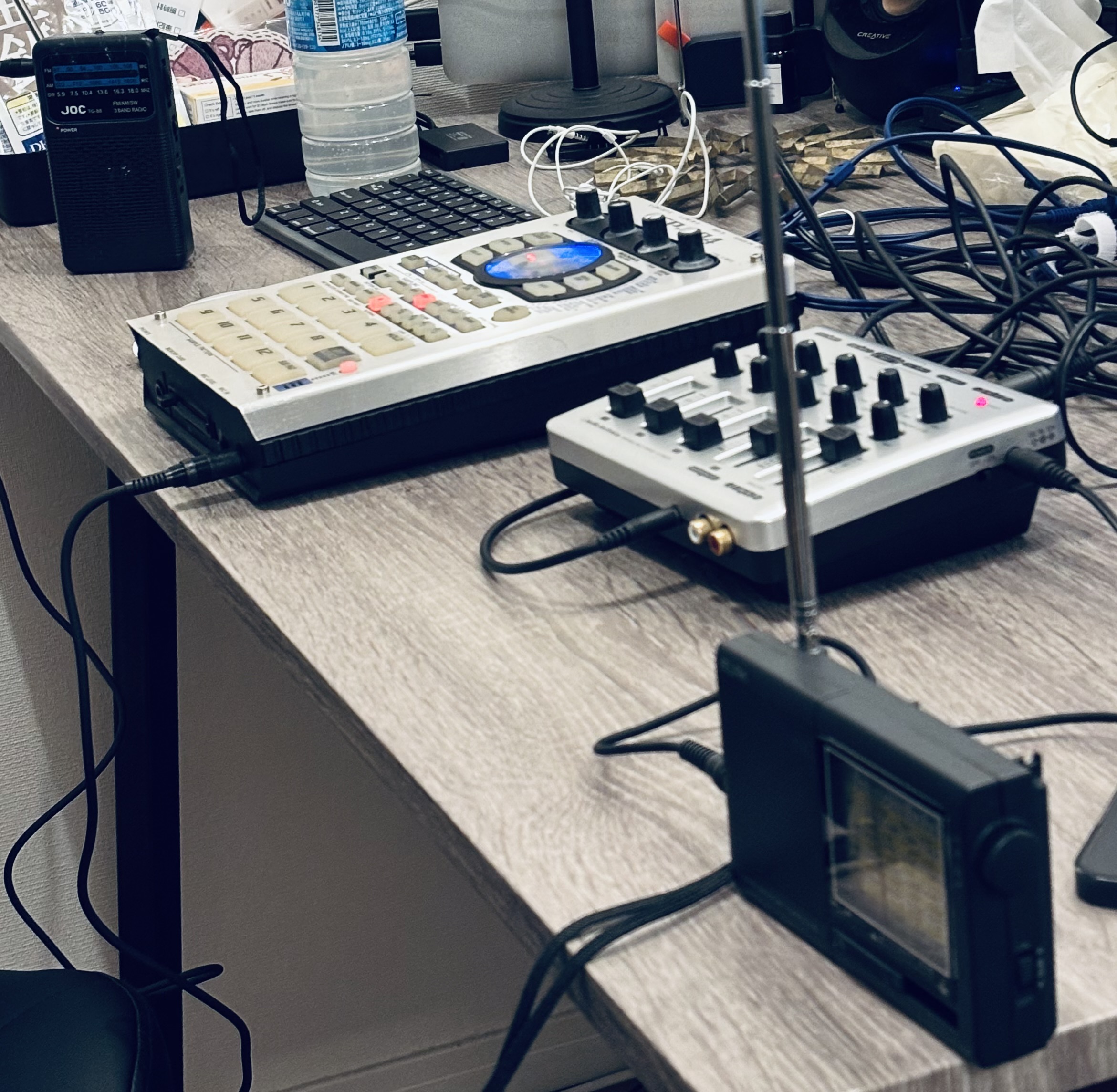 今回は半分冗談で『短波ラジオによるデュオ演奏』を提案したところ、樫山君が「やりますか」とまんざらでもない様子だったので2台の短波ラジオによる即興演奏を3曲録音。