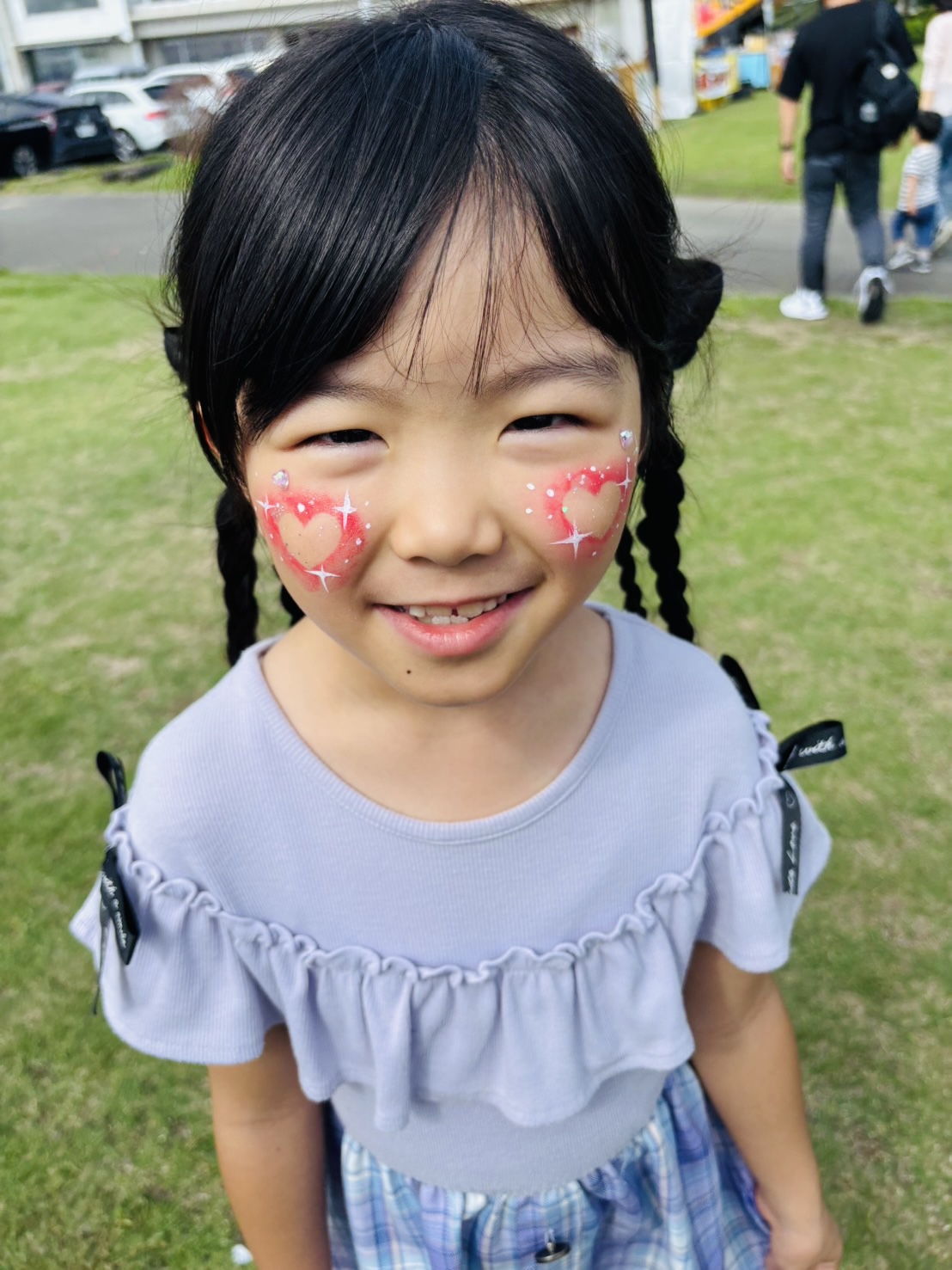 丁度昼食時だったので出店を色々見て食べ物を買ったりしつつ、娘(長女)が興味を引かれた輪投げだったりフェイスペイント(↑写真参照)を楽しんだ。それにしても凄いねこのフェイスペイント。キラキラの部分も加工ではなく顔に描いてくれてるんだぜ。