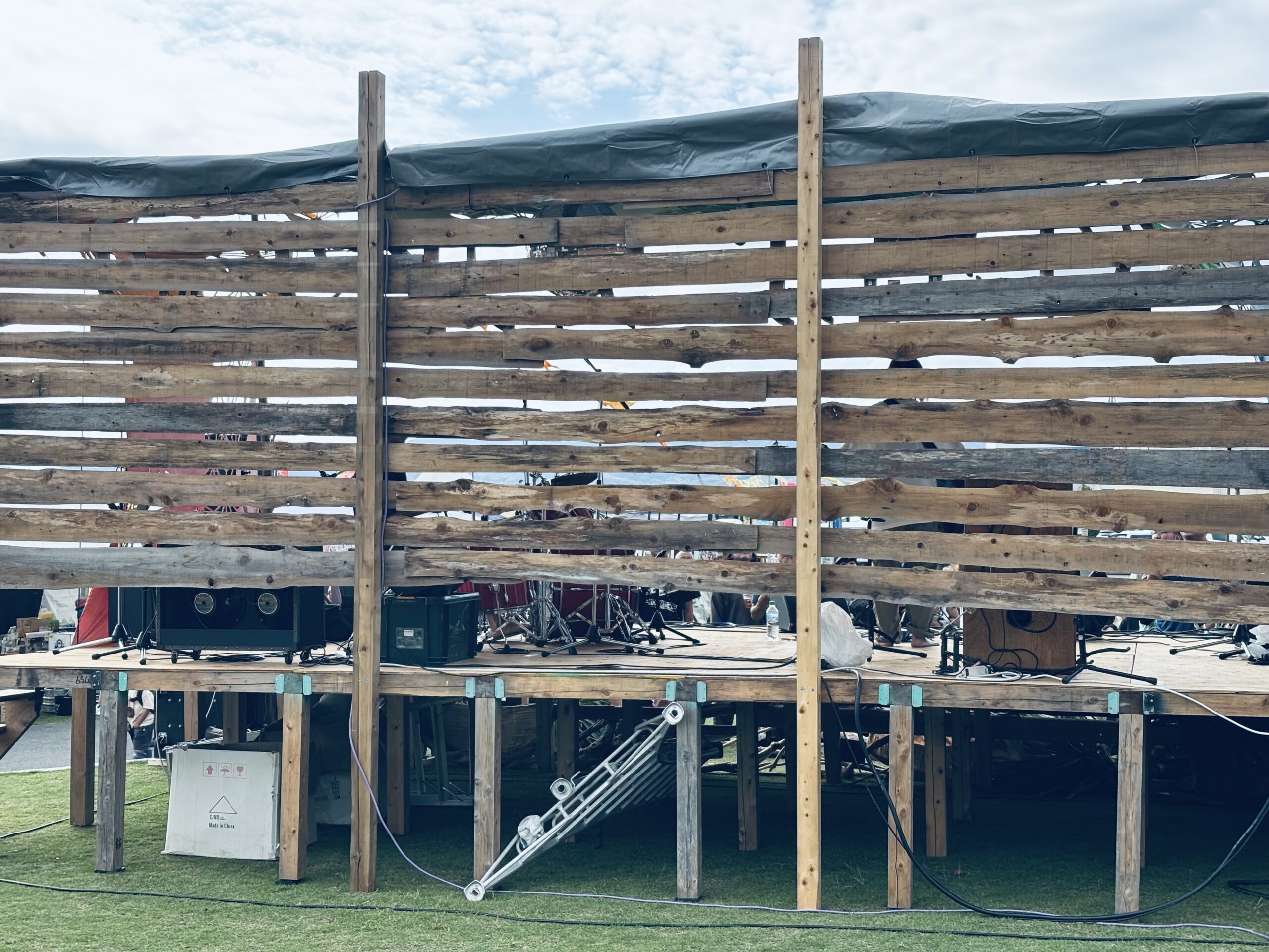 物販スタッフを担当する彼女はステージ付近で待機。いくら屋外で音が拡散するとはいえ、聴力にダメージを与えるといけないので娘(次女)はイン抱っこ紐で僕と一緒にステージから距離を取って遠巻きにライブ観覧。