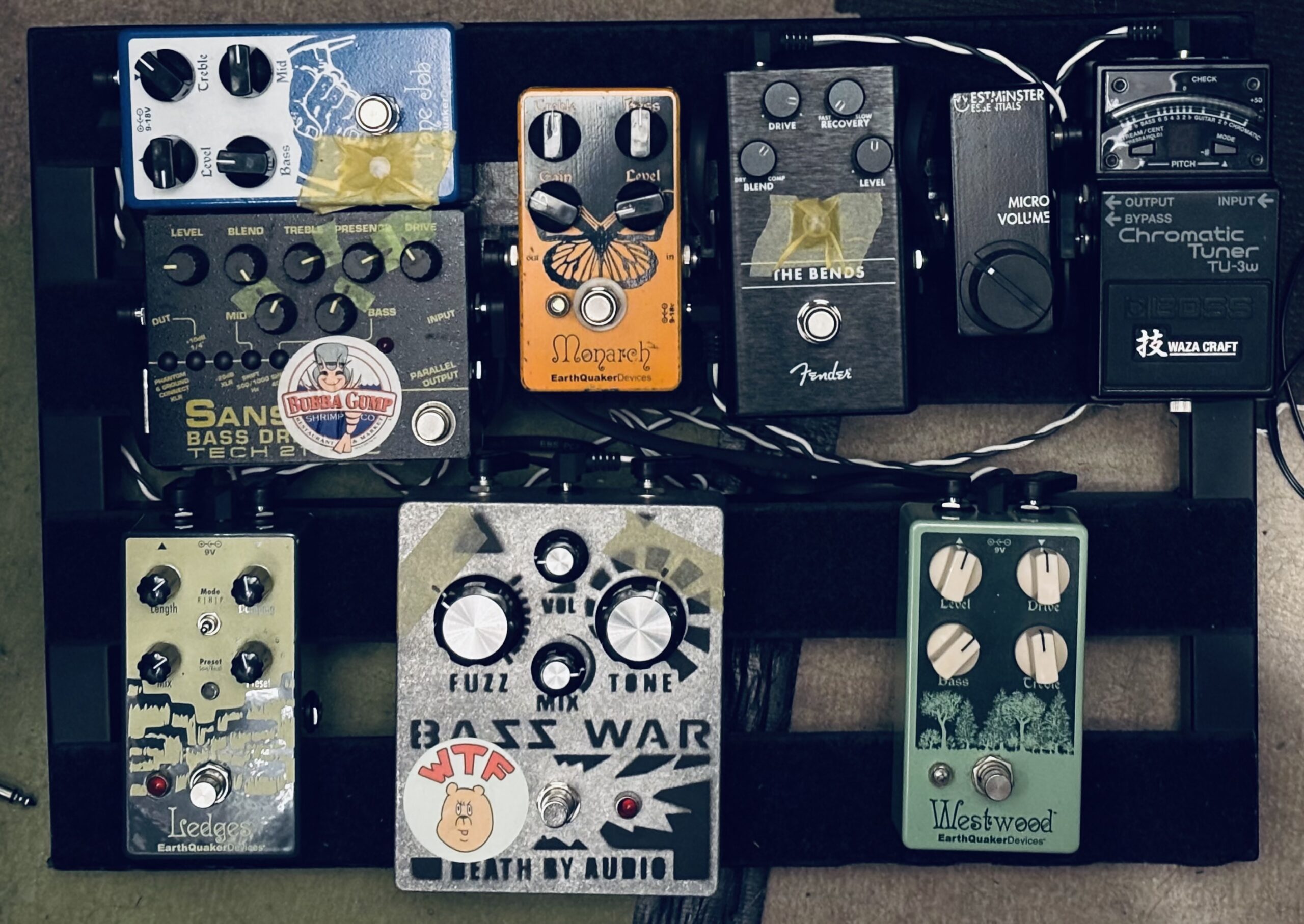 常時オンのコンプレッサーにプリアンプ、EQは変わらずで「ちょっと歪ませるための」EarthQuakerDevices westwoodと「思いっきり歪ませるための」DEATH BY AUDIO BASS WAR、「やっぱりちょっとウェットに残響」なEarthQuakerDevices Ledgesとシンプル極まりない構成。