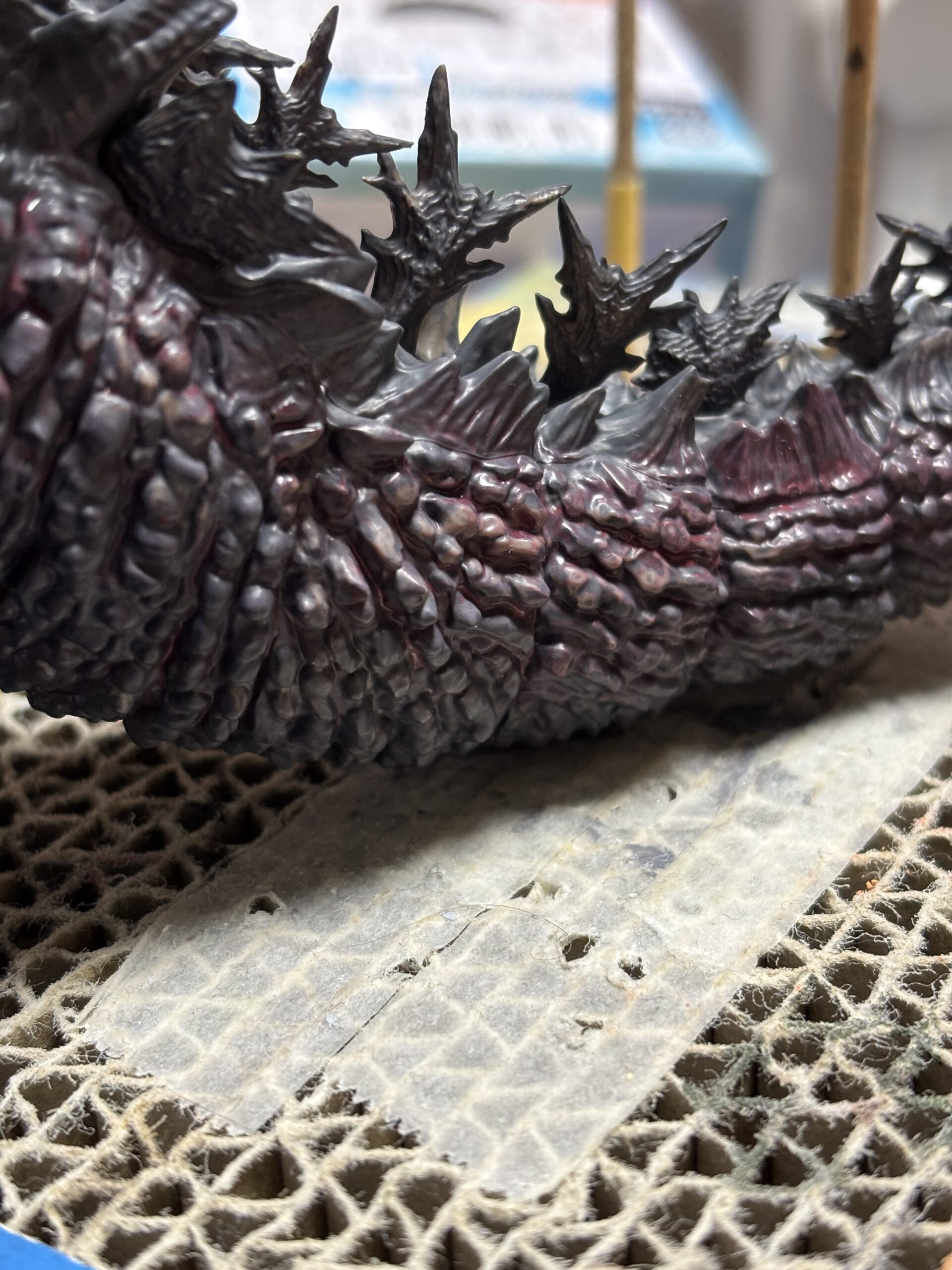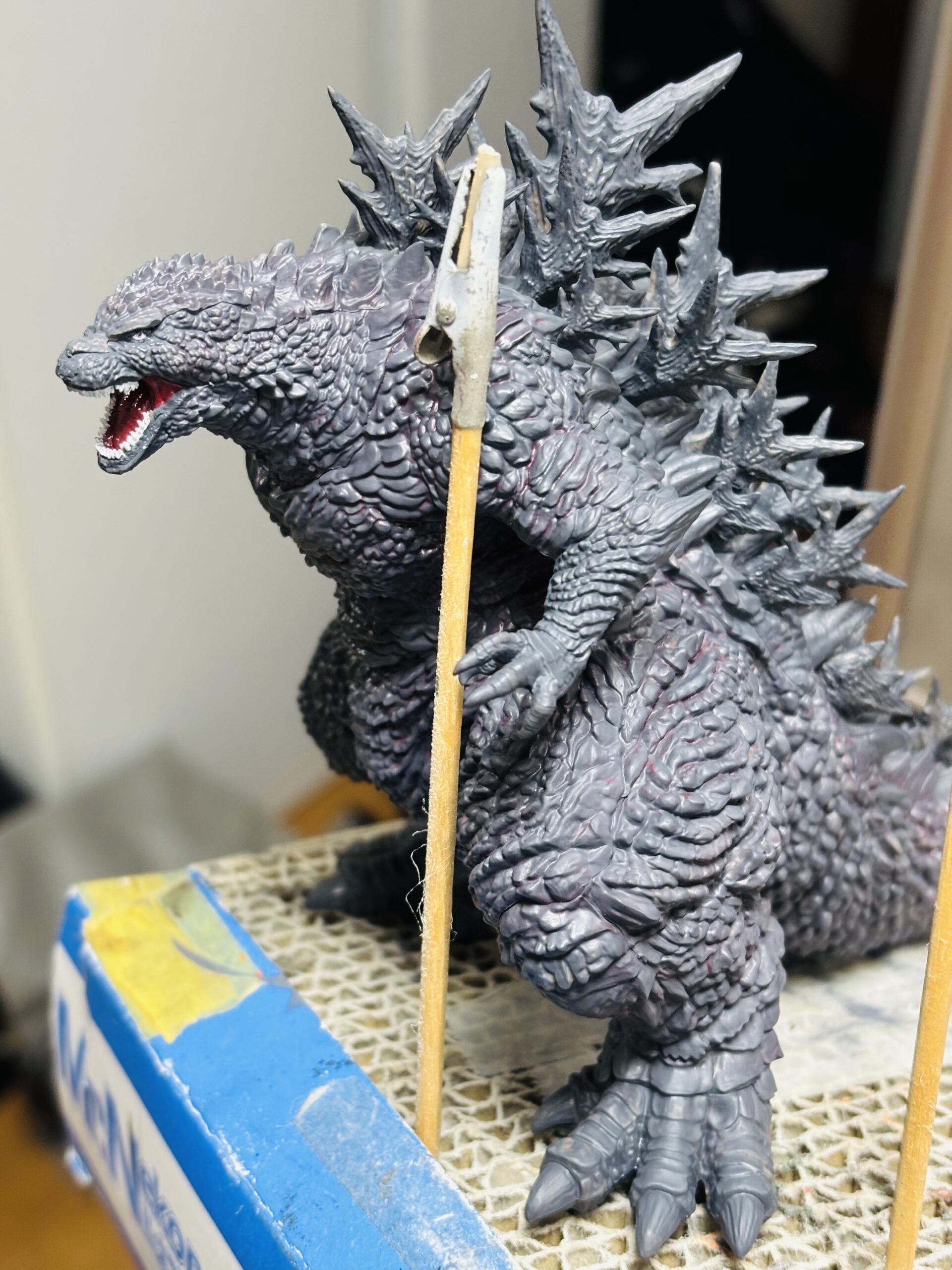 バシャバシャにした水性アクリル塗料はゴジラの皮膚の溝に流れ込んで良い感じに立体感というか質感を強調してくれる。