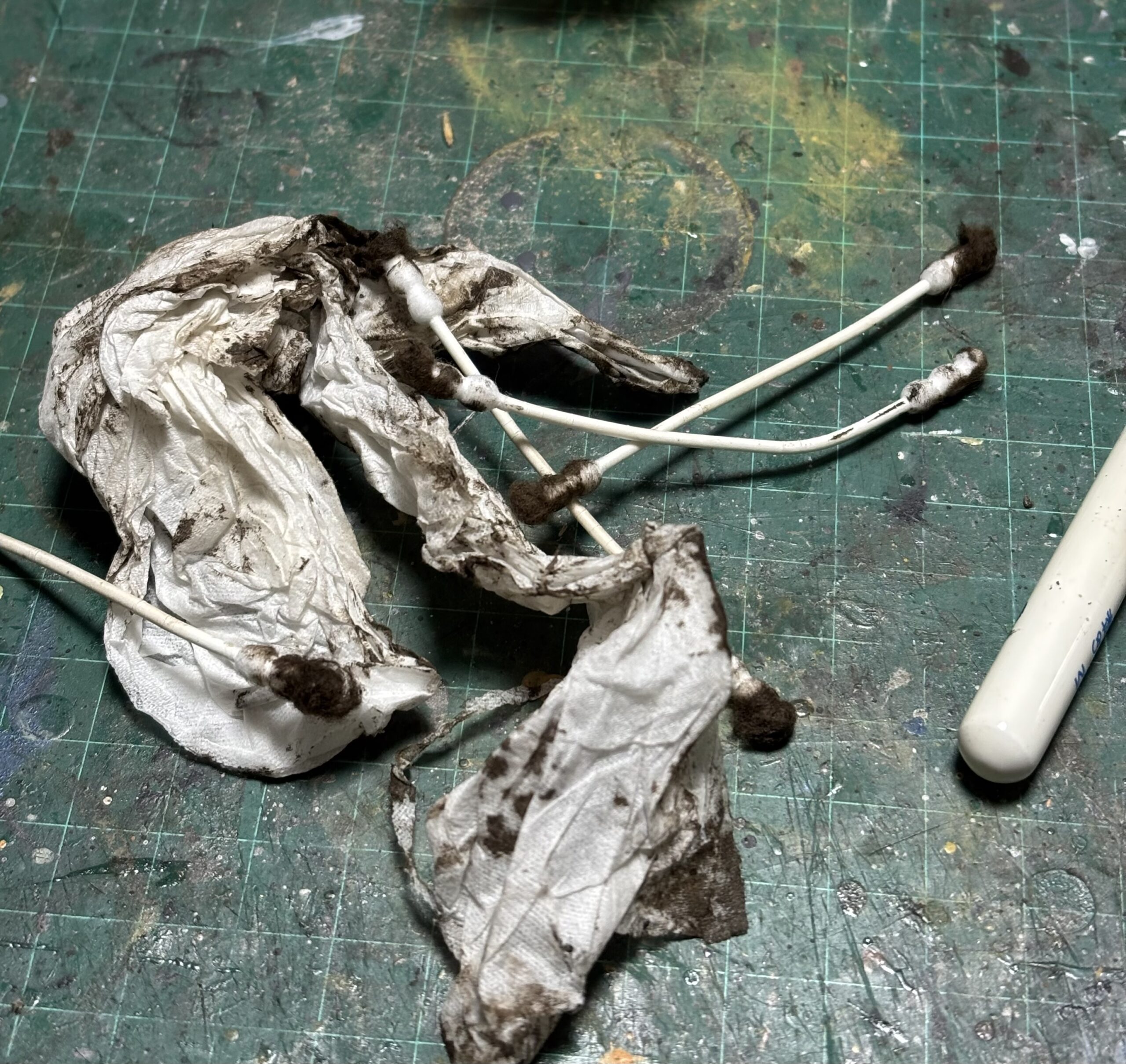 Mr.ウェザリングカラーのブラウンをドバッと(加減しつつ)筆で塗ってはティッシュや綿棒で拭き取っていく。