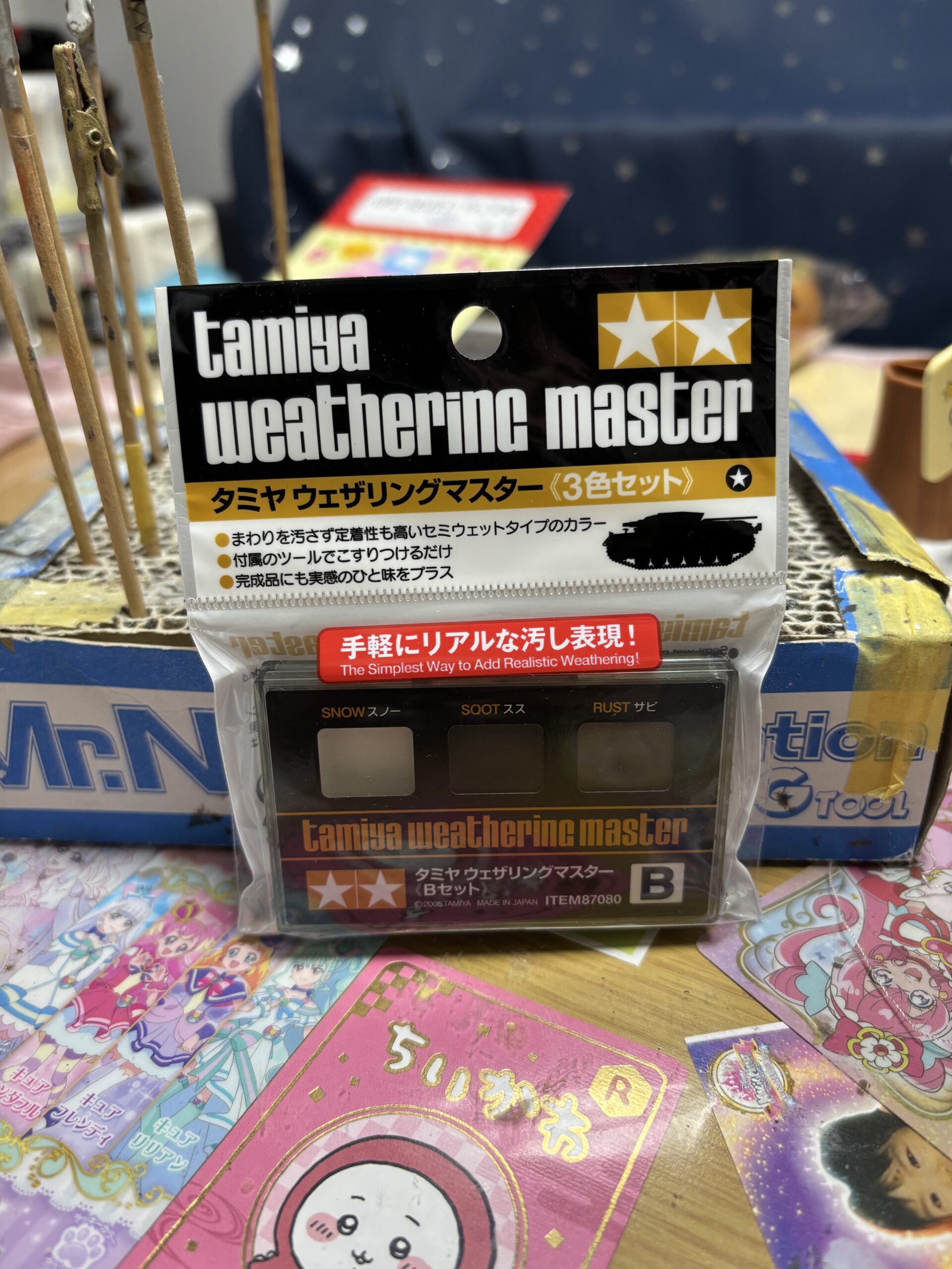 「ドライブラシが苦手ならウェザリングマスター『B』セットのスノーを付属のブラシでサッサッとやるとエッジが綺麗に出る」と先輩諸氏の製作記録で目にしたので、早速購入。粉をサッサッとやるのならば、ドライブラシに挑戦して失敗するより遥かにハードルが低そうである。
