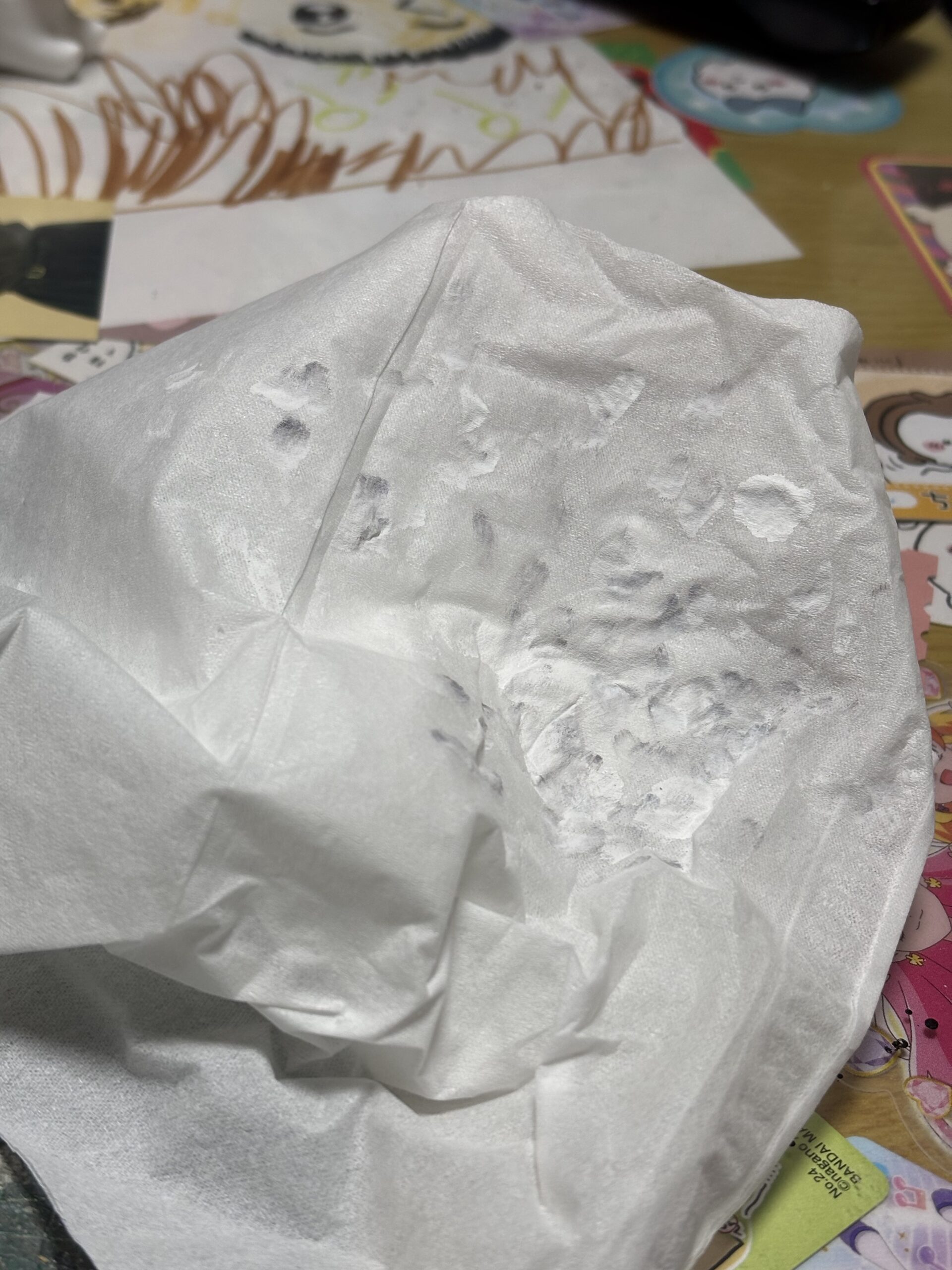 水性アクリル塗料の『ホワイト』を筆にちょんっとつけてそのままティッシュの上に何度もトントンと叩きつけ、筆先の塗料を落としてやる。