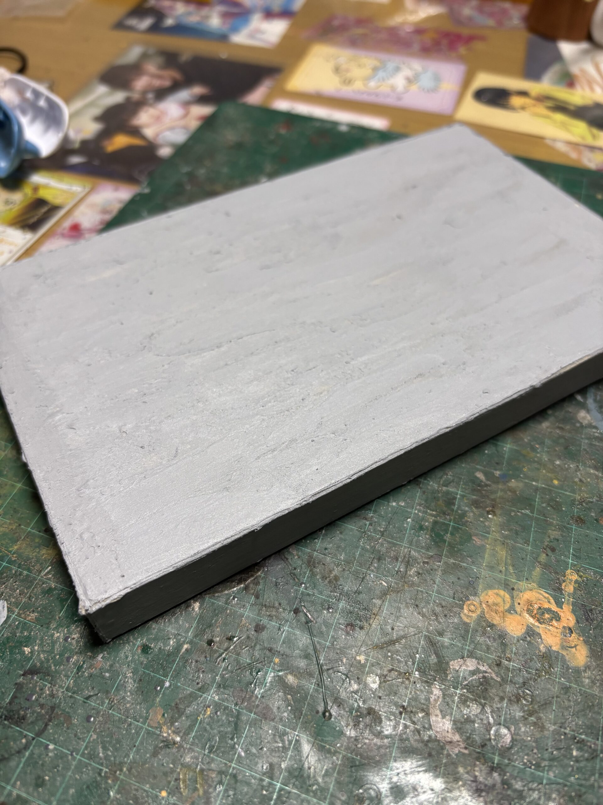 そろそろ台座も用意せねば、と木片の四隅に厚紙を貼って整えたもの(ナッツロッカーを製作した時に作ったものだと記憶している)にパテを塗りたくる。