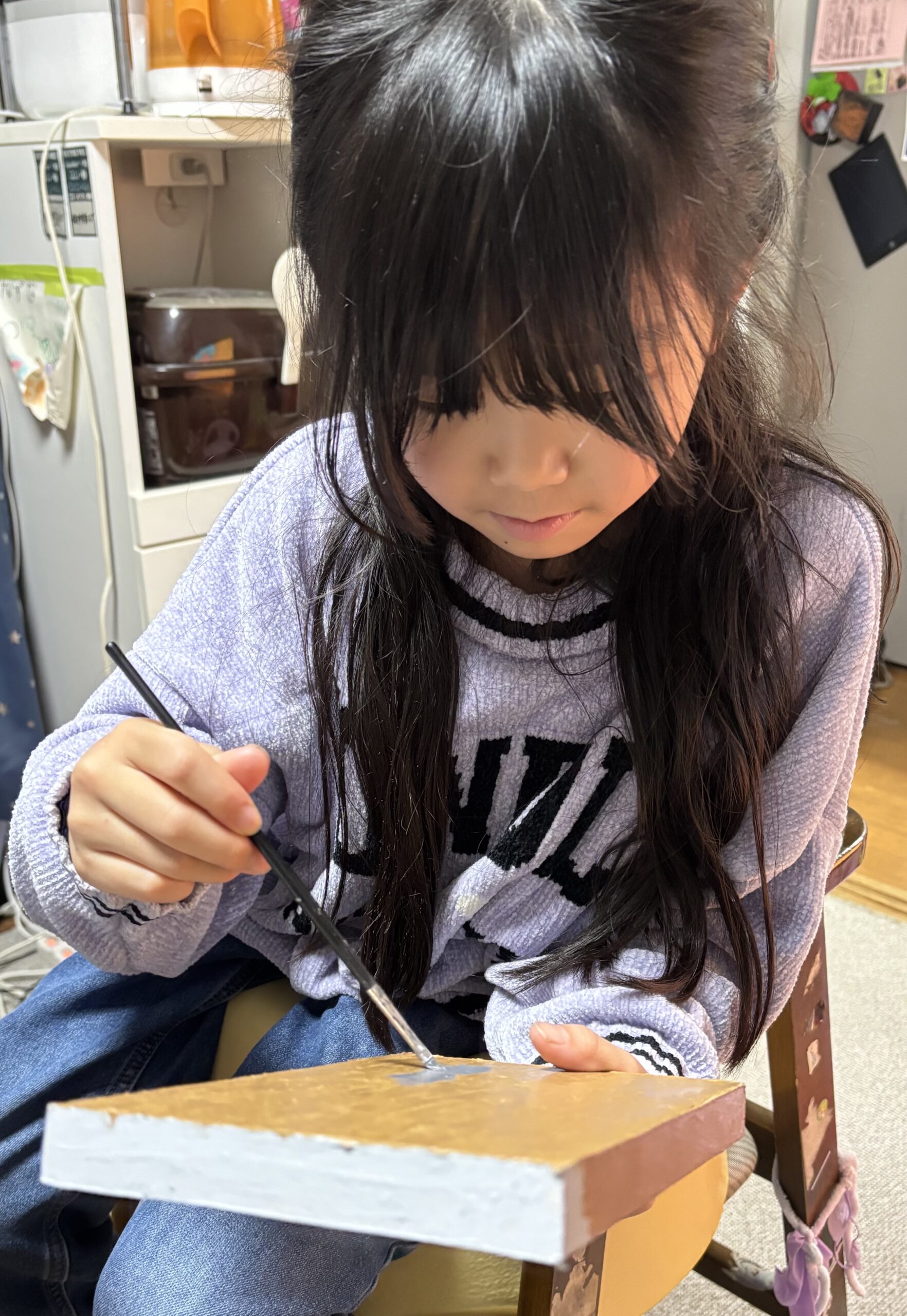 水性アクリル塗料ならば、リビングで妻と娘(長女)がテレビを観、娘(次女)がベビーベッドの中でコロコロしている間にテーブルの片隅で筆塗りを施す事が出来る。