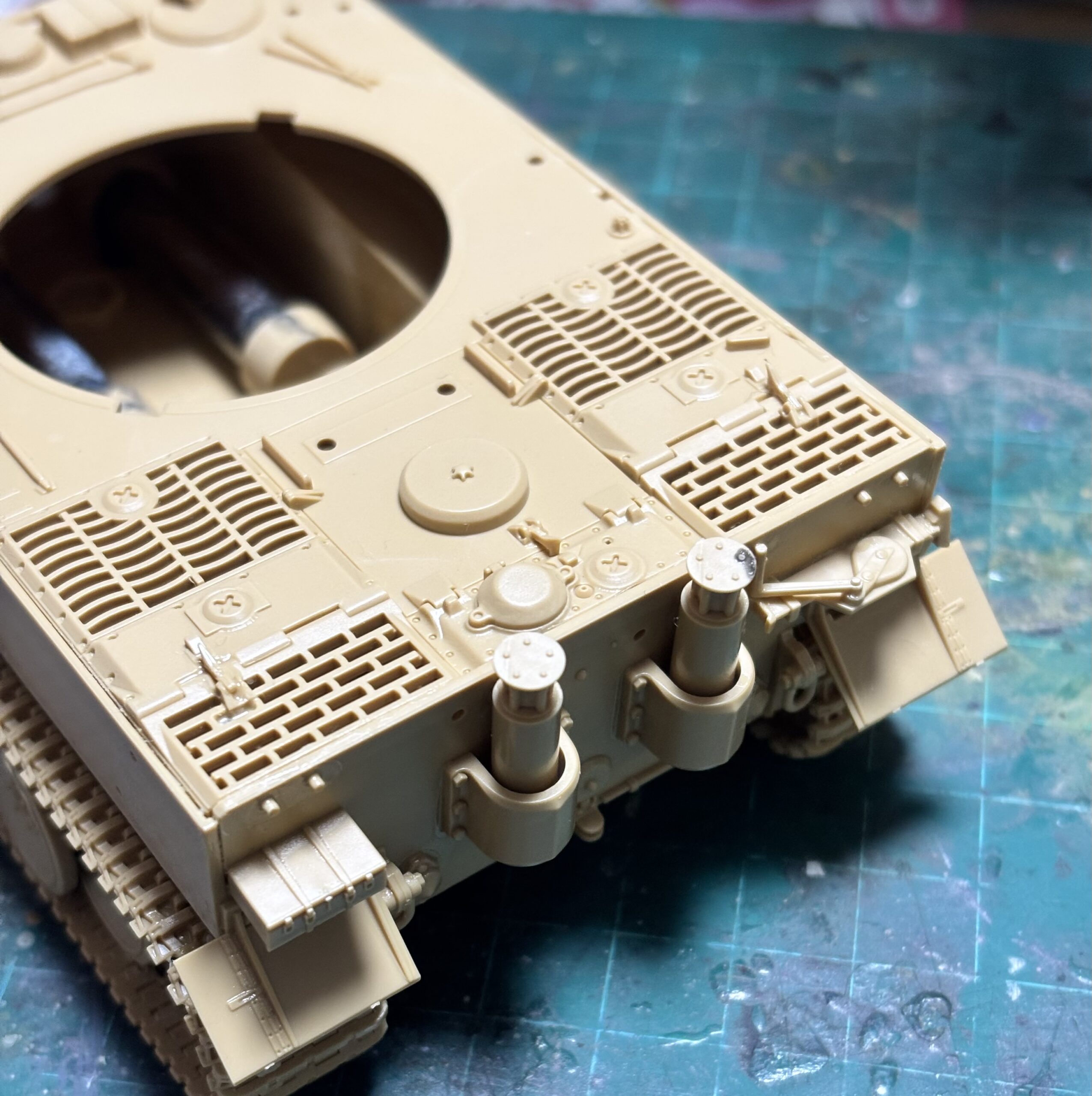 パーツをガシガシ接着していくとゴッツいエアフィルターが出来上がる。車体後部の機関室周りはM4シャーマンのスッキリさと比べるとゴツゴツしていて格好良い。