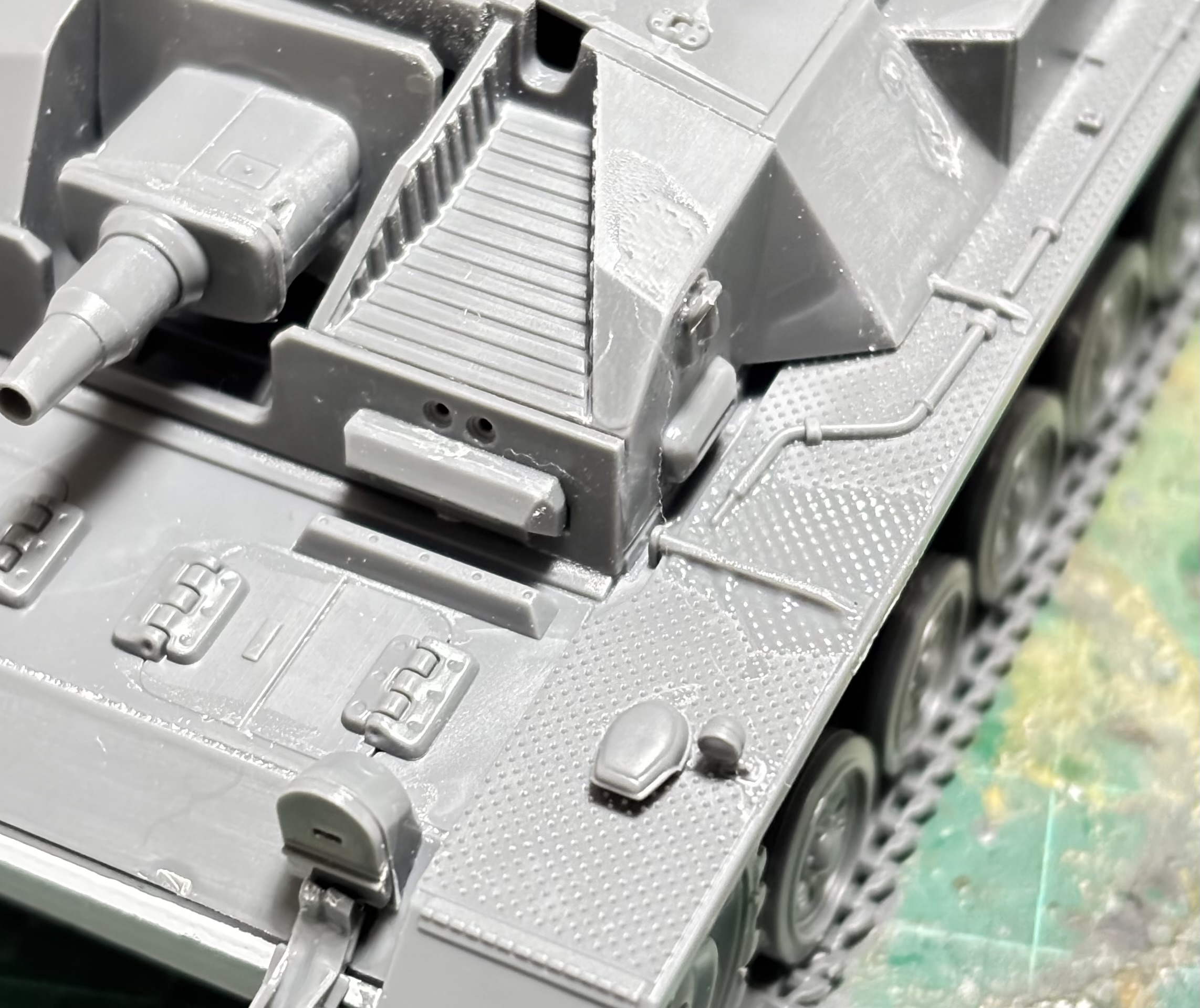 戦闘室まで設えたのだが、細かいヘッドライト等のパーツをまだ接着していないのであった。