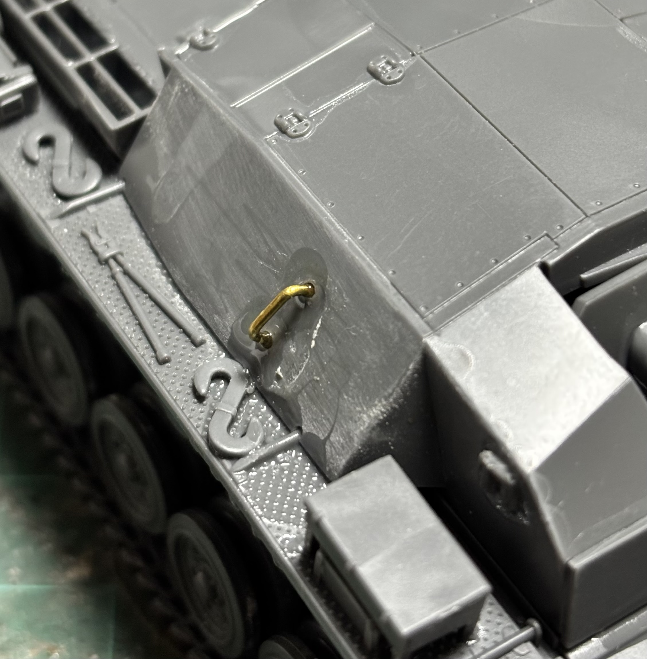取っ手パーツが折れたので、パテでライトをでっちあげた勢いで左右の取っ手を真鍮線に置き換える事とする。