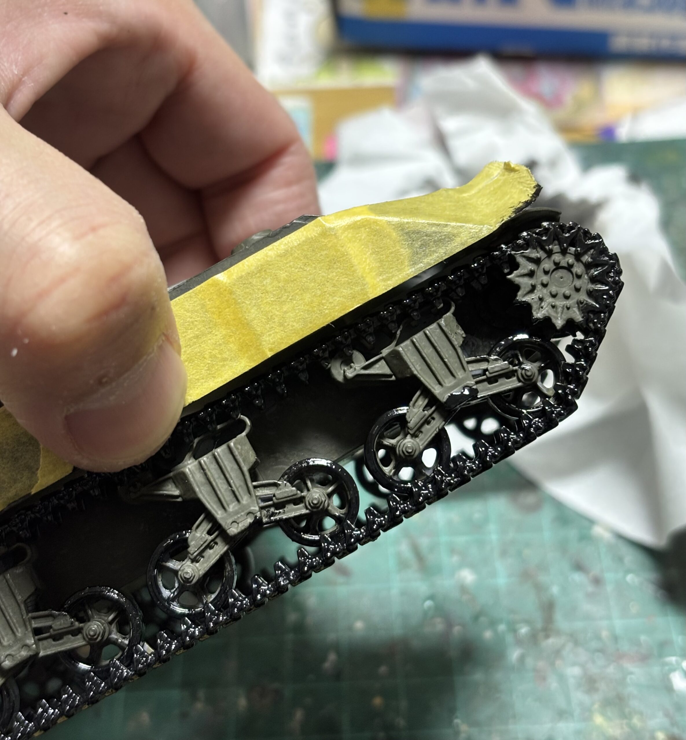 接着前に塗装しておけば良かったのだが、一部の履帯を塗ろうとするとどうしても筆がフェンダー部に干渉する。