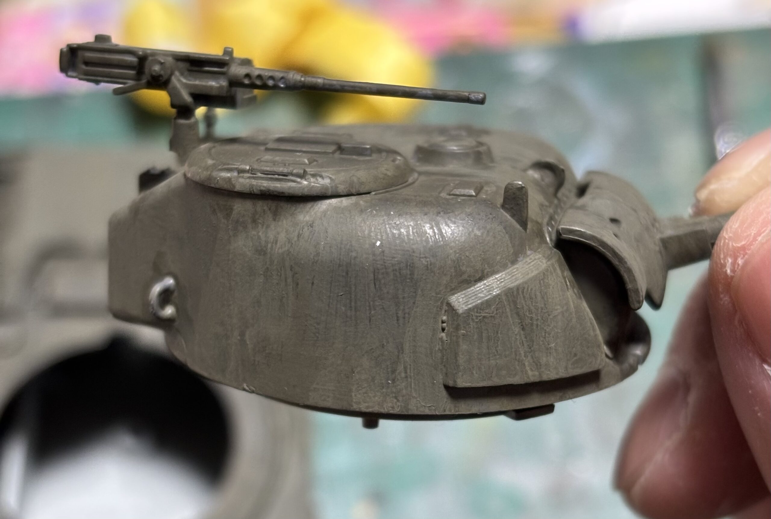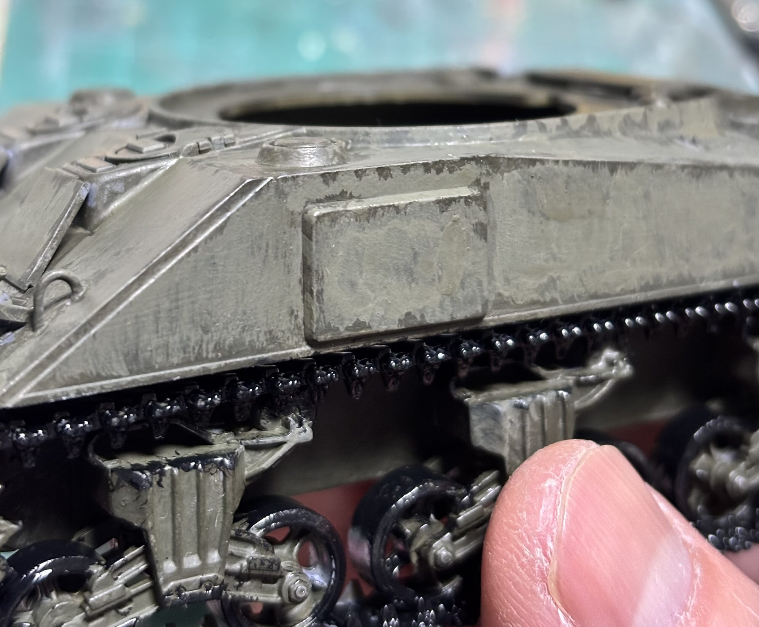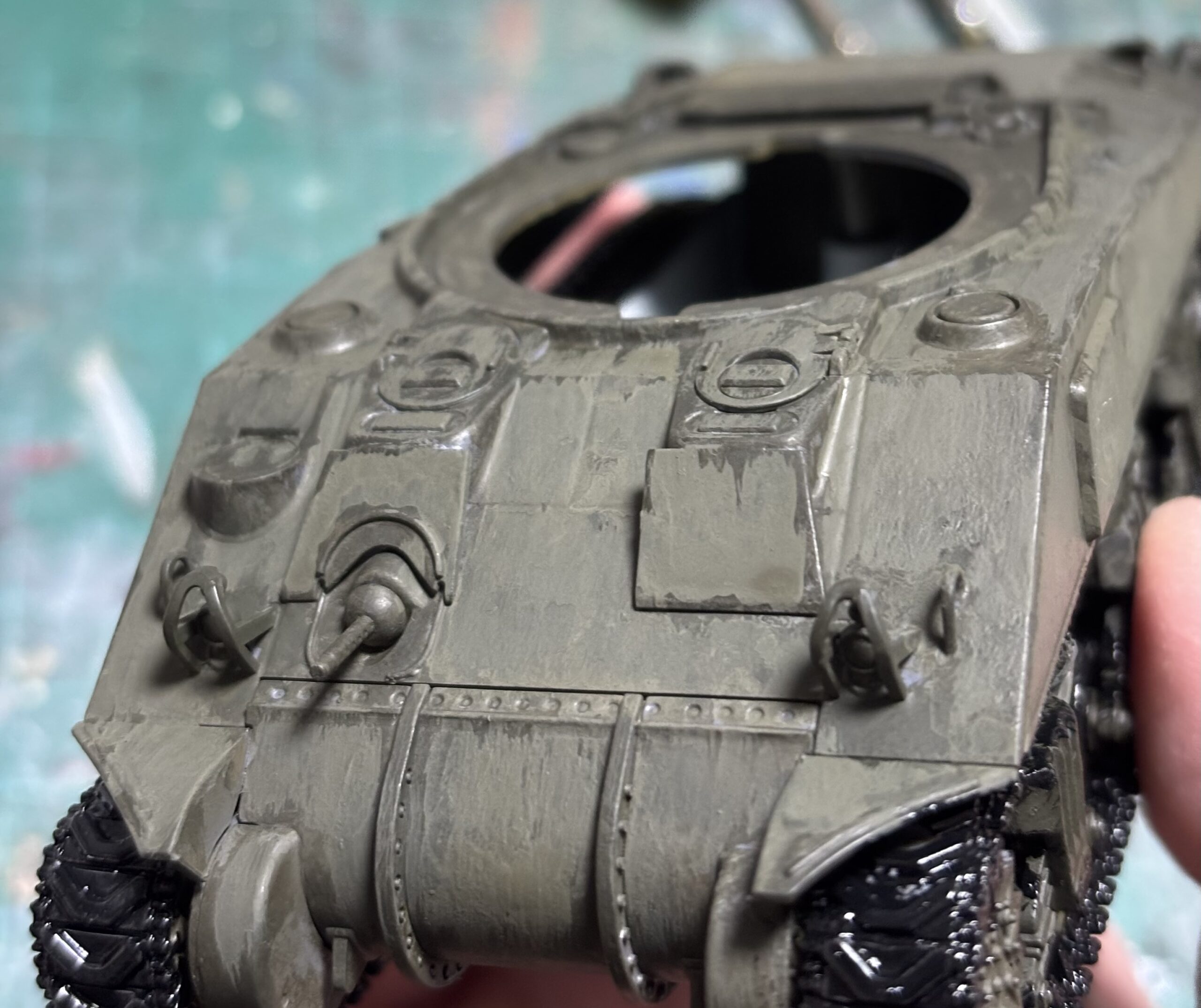 最初に塗ったオリーブドラブが汚れだったり風合いになっており、何だか既にウェザリングしたみたいな風情を醸し出す車体。