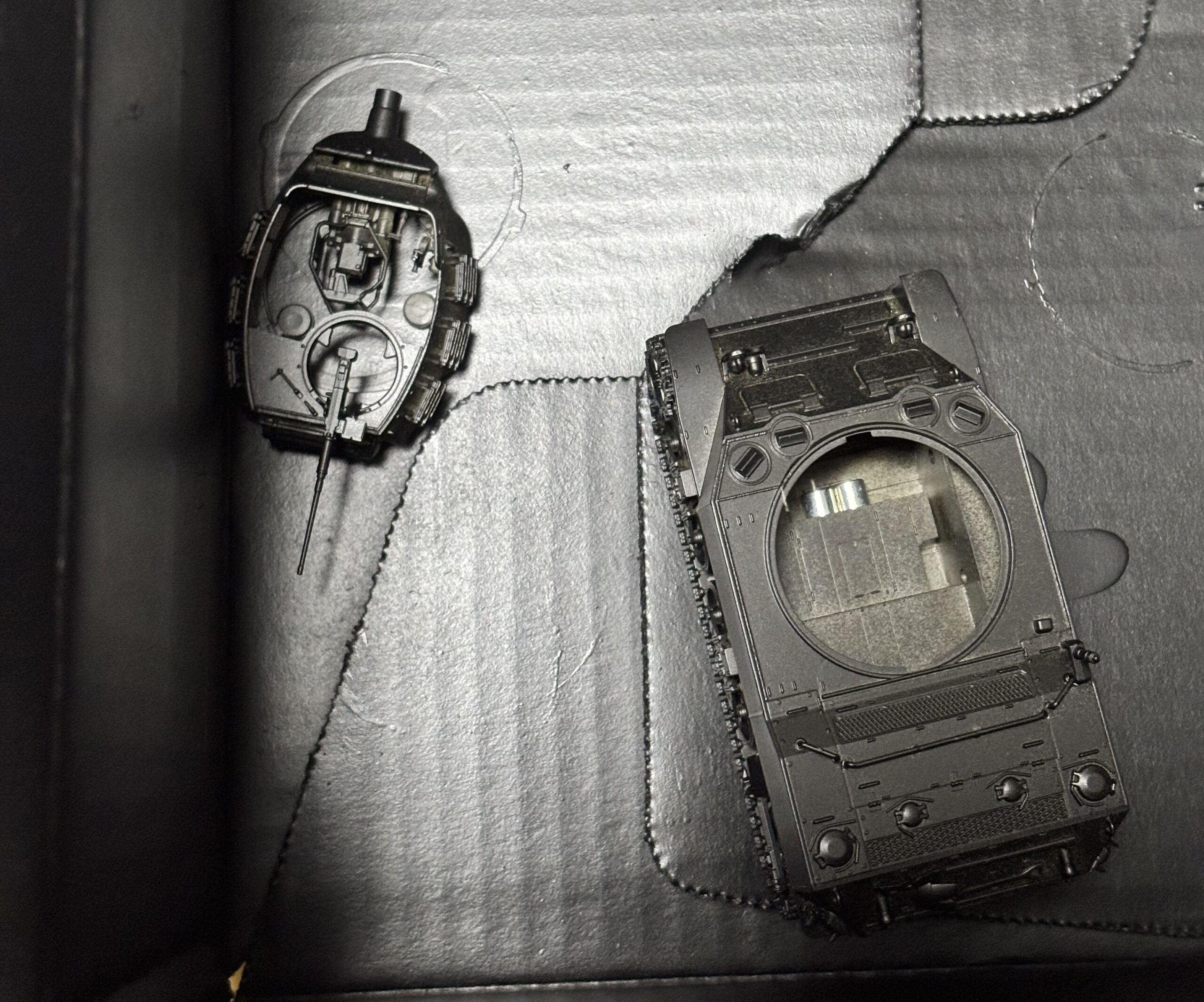 オープントップ(何度も書いている気がするが、屋根がない車内剥き出しって事ね)の砲塔、完成後も内側が見えるしちゃんと中に装備品を入れるように小物入れみたいなディティールも施されているのでちゃんと塗装したい。