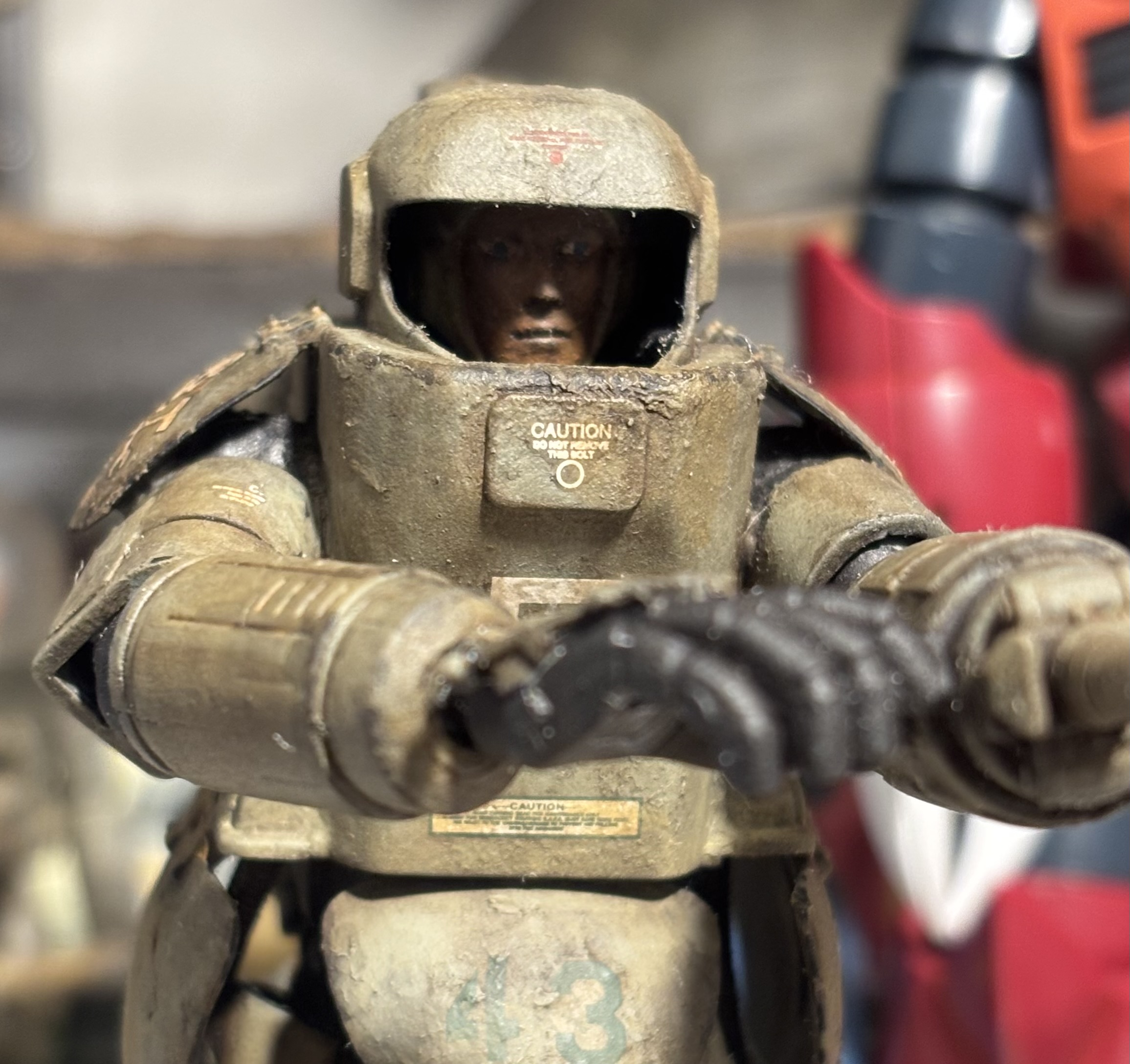 ヘルメット部分のクリアパーツは省略して正解だった。マシーネンクリーガーの製作を始めてもうすぐ1年、初めてパイロットの顔をちゃんと塗ったので折角なら見えるようにしたいものね。
