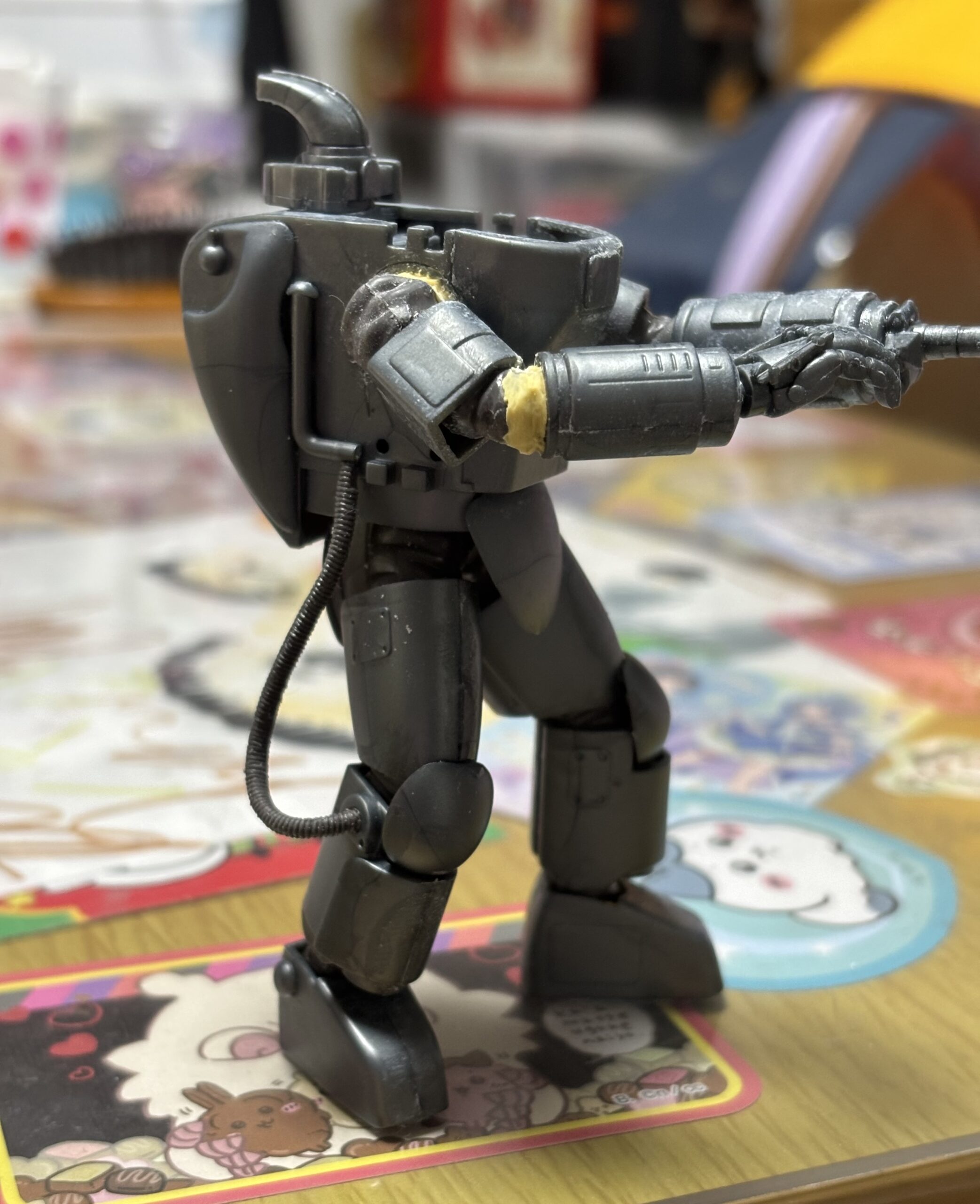 普段ならば絶対にそんな作業には従事しようもない朝の一時、シャツとスラックスでレーザー砲に見立てた左腕を突き出して「こうかな」「いや、こうか」とかブツブツ言っては模型を触る父親を娘(長女)はどう見た事だろう。